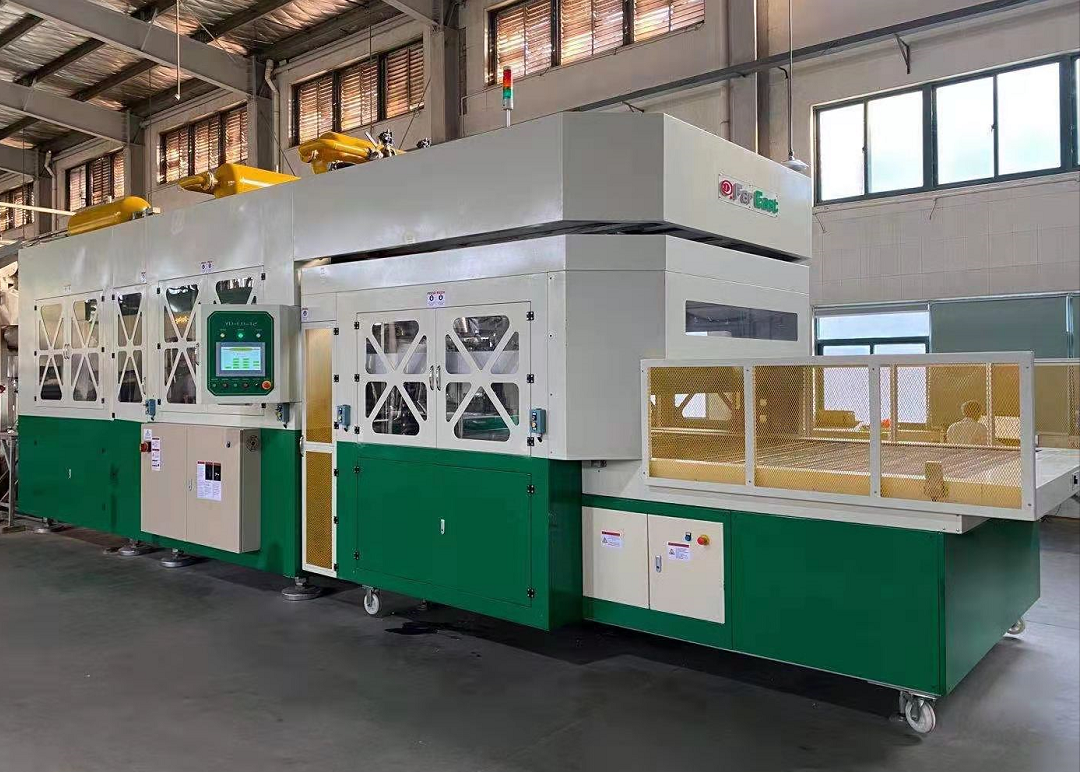 该机日产量为1400-1500公斤,是一款高效节能的全自动纸浆模塑餐具机。其专利的免修边免冲孔技术可有效降低能耗,从而降低生产成本。免修边效果好,已获得市场认可。